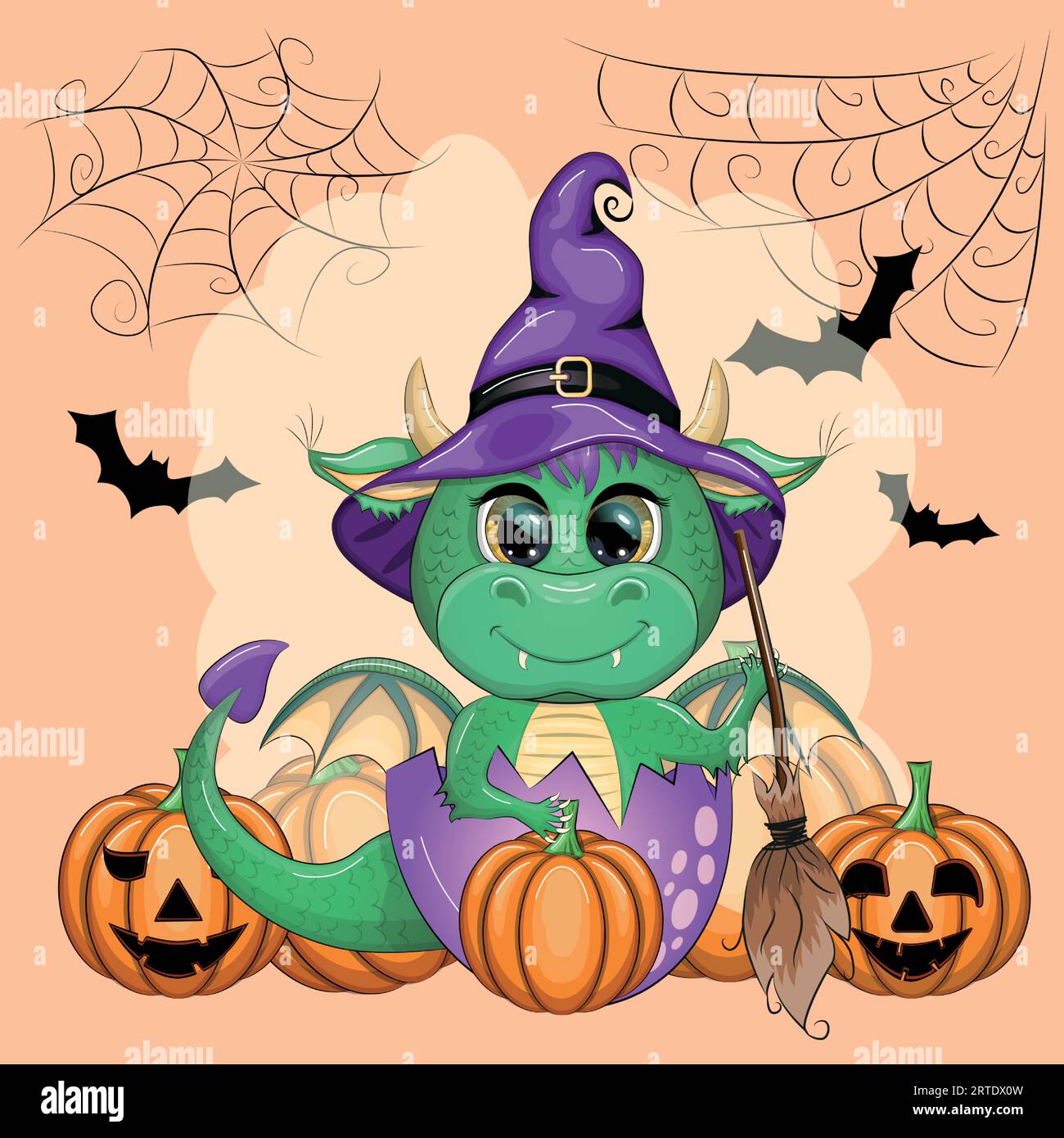 Cute cartoon green dragon in a purple magic hat, Halloween